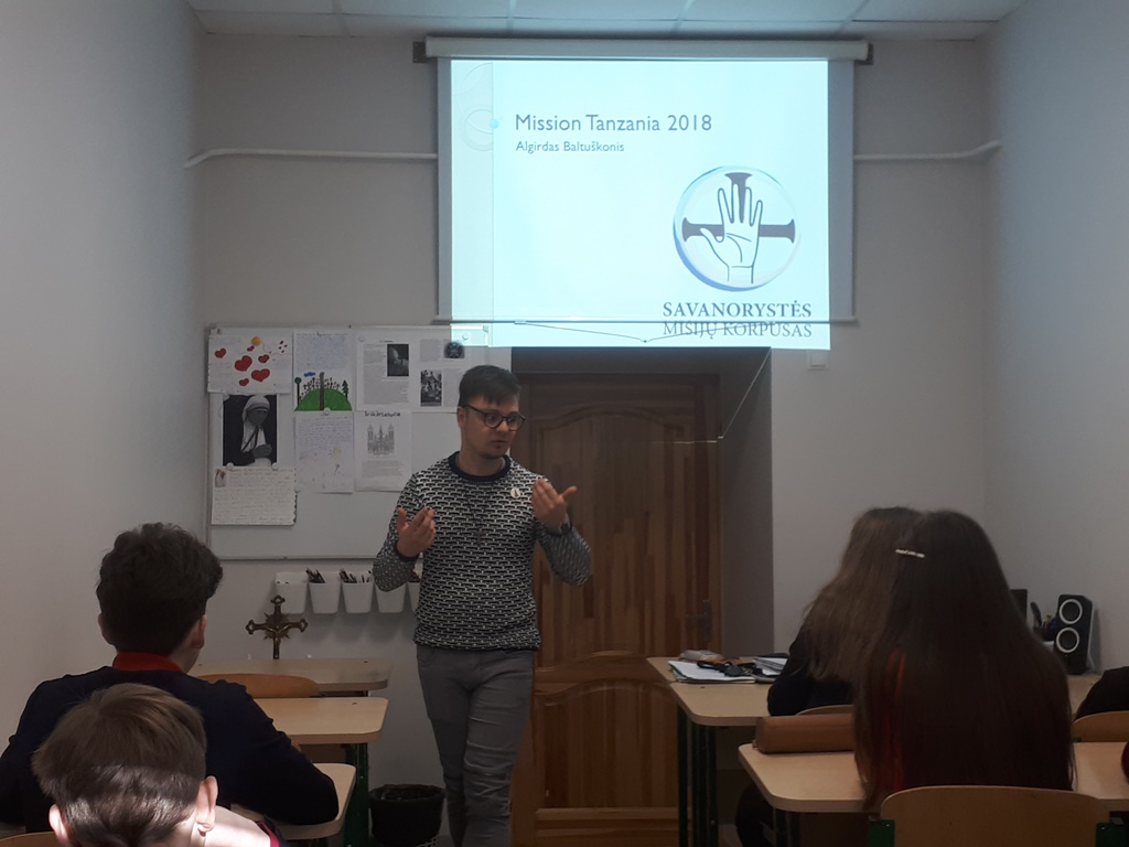 2018 m. birželio ir liepos mėnesiais būrys jaunuolių iš Lietuvos vyko į karitatyvinę misiją Tanzanijoje. Apie šią kelionę ir Savanorystės misijų korpuso veiklą 2019 m. kovo 6 dieną 6b, 6m ir 7m1 klasių mokiniams papasakojo misijų dalyvis Algirdas Baltuškonis.