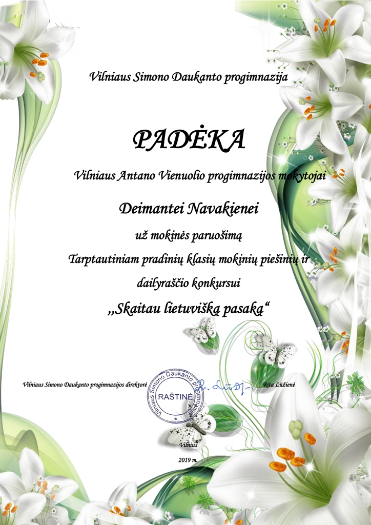 Džiaugiamės 1a klasės mokinės Džiugilės (mokytoja D.Navakienė) sėkme tarptautiniame pradinių klasių mokinių piešinių ir dailyraščio konkurse „Skaitau lietuvišką pasaką“. Konkursą organizavo Vilniaus Simono Daukanto progimnazija. Džiugilė su piešiniu "Molio katinėlis" tapo laureate. Sveikiname!