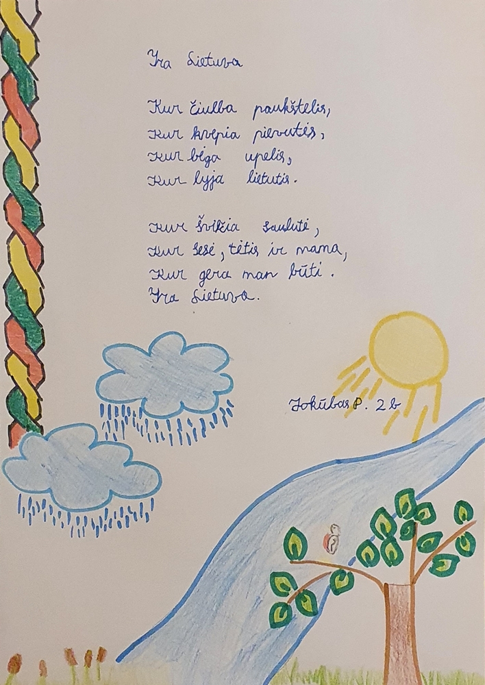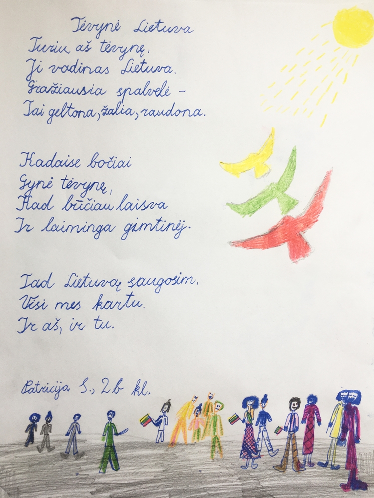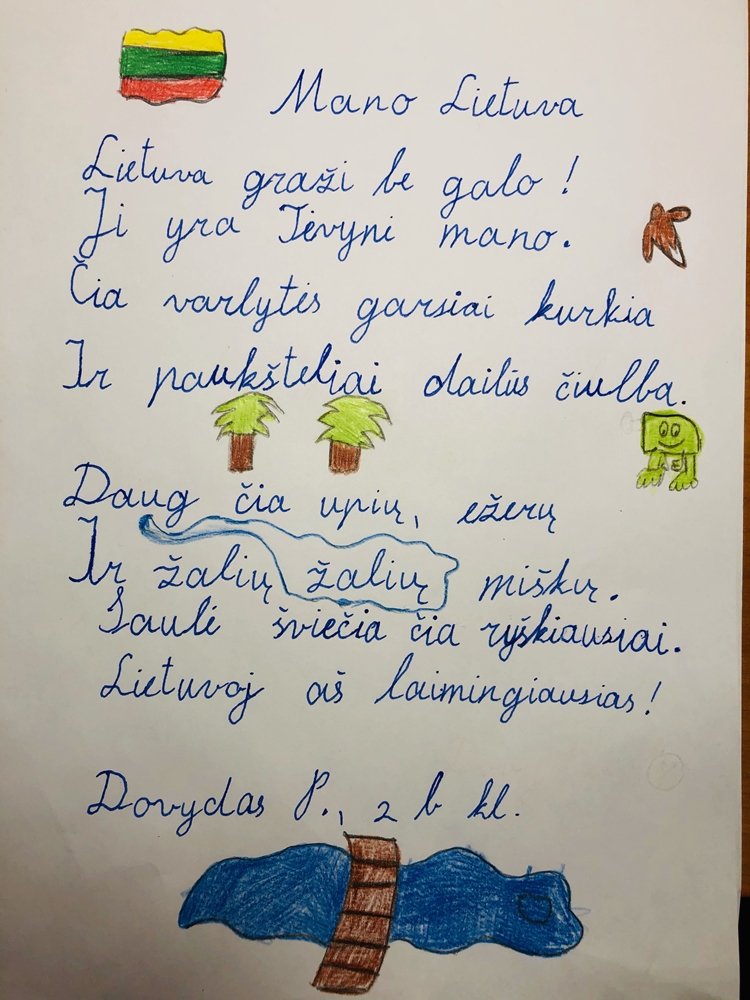 Šiek tiek ūgtelėję trečiokai, paskatinti mokytojos Deimantės Navakienės, Lietuvos Nepriklausomybės atkūrimo dieną minėjo atlikdami kūrybinius darbus, skirtus Lietuvai. Lietuvių kalbos pamokose kūrė eilėraščius apie Lietuvos gamtos grožį, upes, ežerus, pilis, miškus, apie atėjusį pavasarį, apie mūsų šalies krantus skalaujančią Baltijos jūrą. Dailės ir technologijų pamokose mokiniai pasirinktomis priemonėmis iliustravo savo kūrybos eilėraščius. Pirmieji bandymai eiliuoti, rimuoti eilėraščio eilutes tikrai vykę. Trečiokų eilėraščiai kupini šilumos, nuoširdumo ir meilės gimtajam kraštui. Vaikų žodžiais tariant, mūsų šalis pati gražiausia, mylimiausia, nuostabiausia. Gražios šventės išvakarėse nuotoliniu būdu vaikai dalyvavo šventinėje klasės valandėlėje „Mano Lietuva“, kurioje, sugiedoję himną, skaitė draugams savo kūrybos eilėraščius ir turėjo galimybę pasidžiaugti vieni kitų kūryba. Trečiokų kurti eilėraščiai: https://www.youtube.com/watch?v=FC6Tnn0tB_g&list=RDFC6Tnn0tB_g&start_radio=1