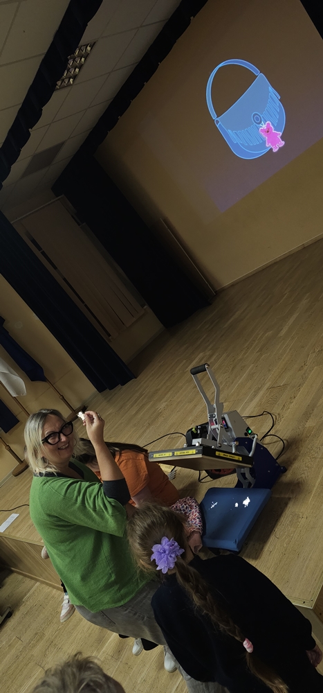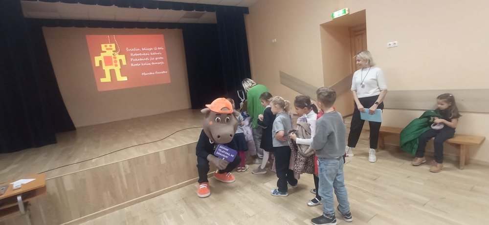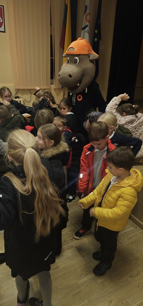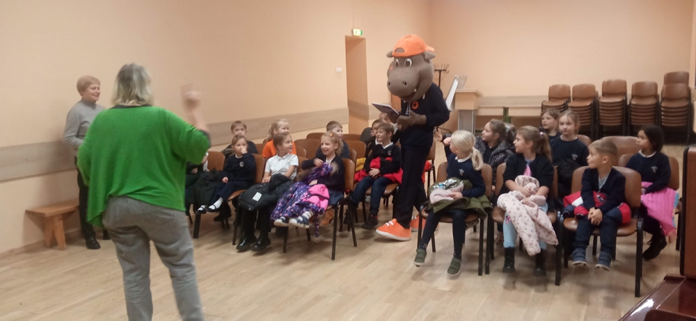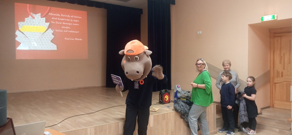 Šios visuomeniškos atšvaitų klijavimo akcijos iniciatorė progimnazijos logopedė Jurgita Pocienė, kartu su progimnazijos vaikų draugu Skipu, pasakojo mokiniams apie saugų kelią ir atšvaitų būtinybę tamsiuoju paros metu.