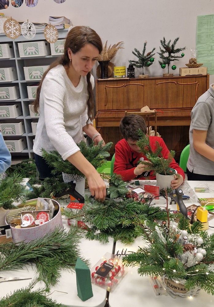 Šiais metais ketvirtokai kartu su tėveliais gamino kalėdines kompozicijas. Visi noriai darbavosi: komponavo eglišakes, puošė jas švieselėmis, dekoratyviniais elementais, gamtinėmis medžiagomis. Kūrybinis procesas skatino bendravimą, bendradarbiavimą ir suteikė galimybę prasmingai praleisti laiką drauge.