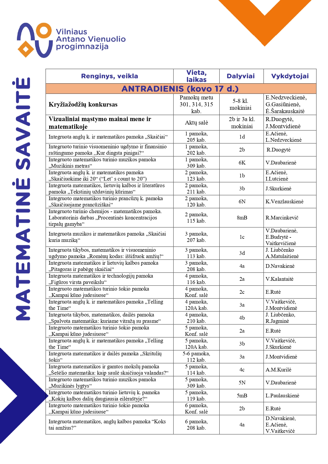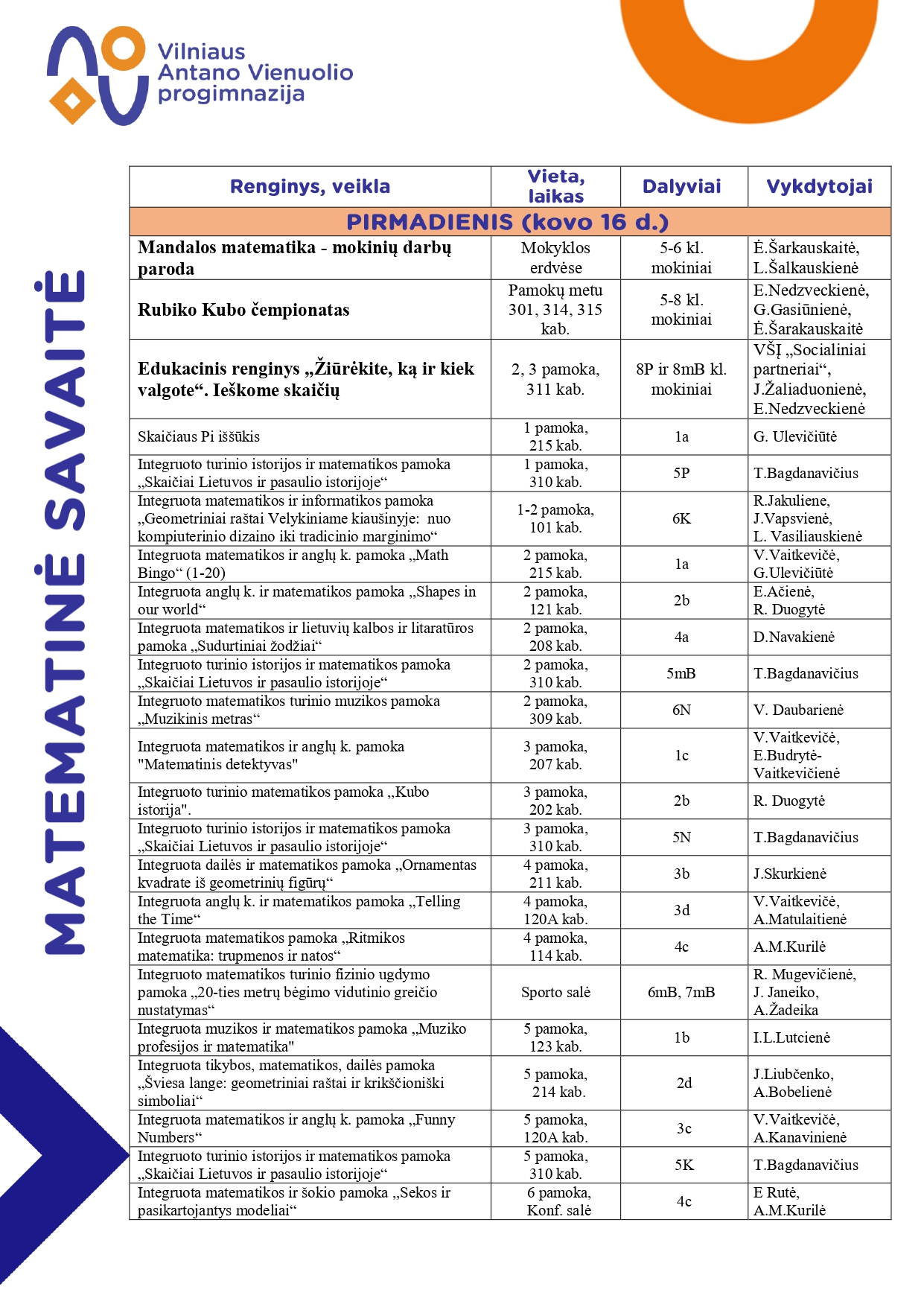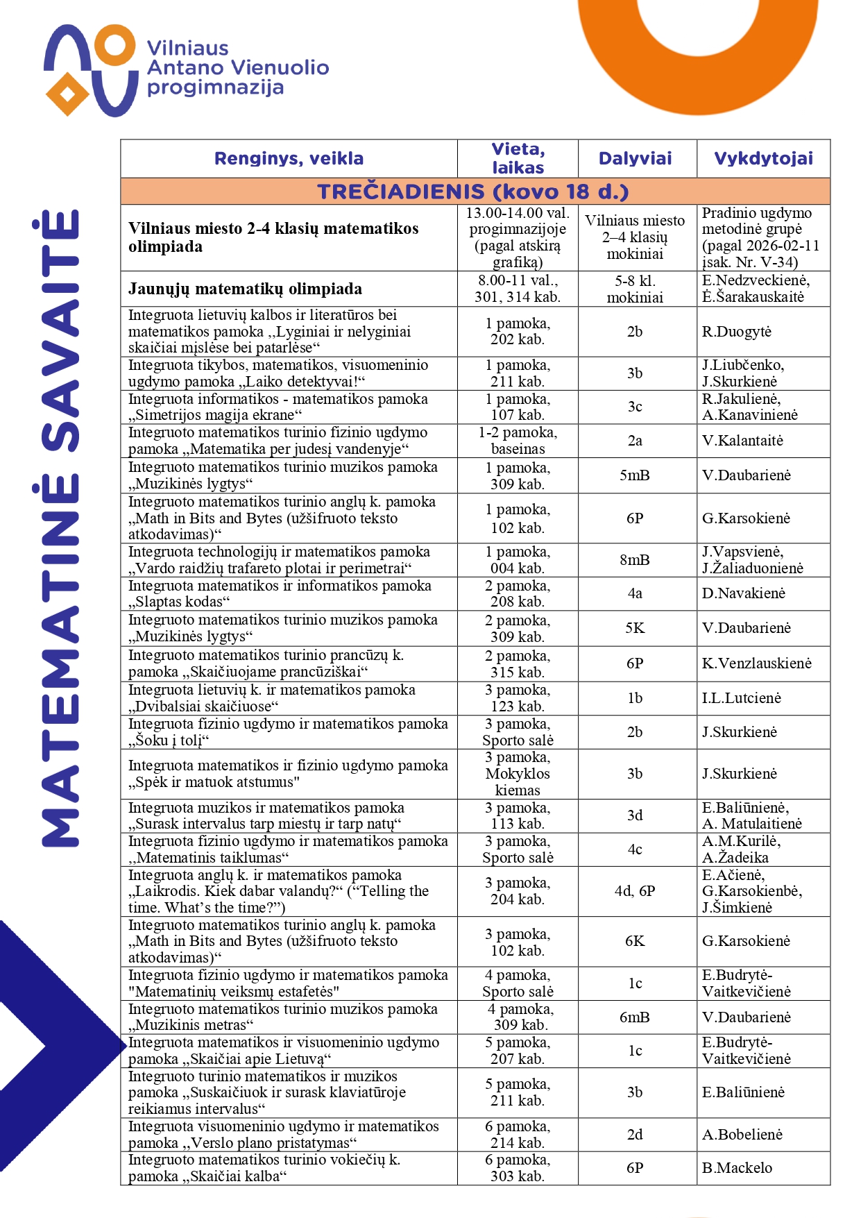 Kviečiame aktyviai dalyvauti MATEMATINĖS SAVAITĖS veiklose 2026-03-13 MATEMATINĖS SAVAITĖS VEIKLOS Priedai: MATEMATINĖS SAVATĖS veiklosAtgal
